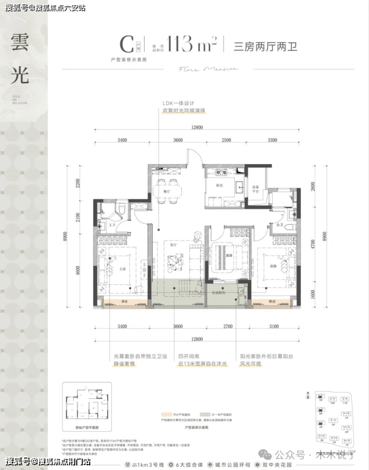另一个是建面约 113方的南厅户型,做到了 四开间朝南,南向面宽达到了约12.8米,宛若了打开了“IMAX全面屏”。