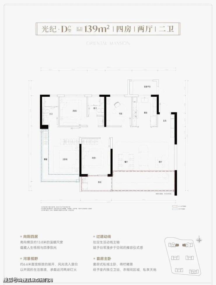 鸣澜里139平户型同样做的不错,打造四房两厅两卫,分为横竖两款,全部为边套,两梯两户设计。其中,139平竖厅户型亮点分析:① 户型得房率超高,达到约93%;② 南向3个卧室,采光优且满足二胎家庭和三代同堂居住需求;③ 客厅面积达到约37平,足够大,同时额外配置约2.6平的储物间。