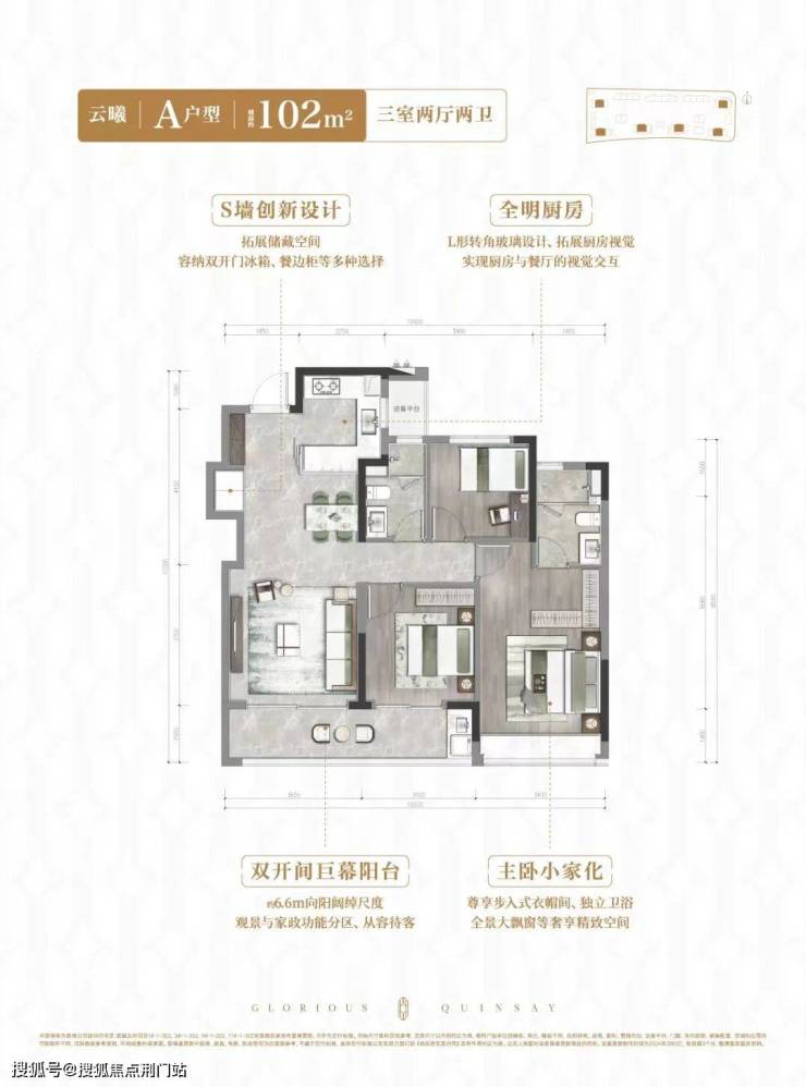 比如起步的建面约102㎡的三房户型,南向整体宽达到了约10米,还巧妙的做了一面“S”墙,可以作为外置双开门冰箱的同时,又可以增加收纳空间;