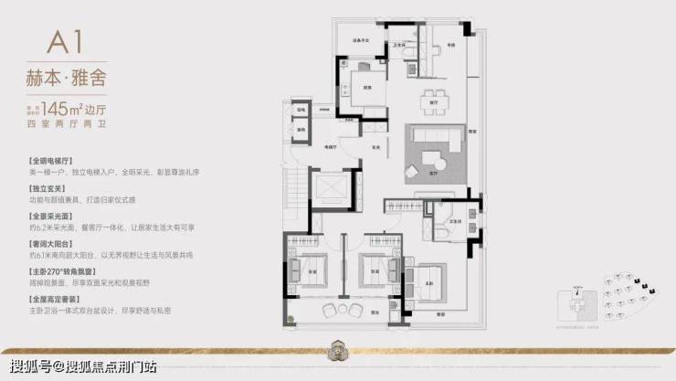 建面约145㎡的户型:项目采用创新的"两梯两户"设计,通过巧妙的空间规划实现类一梯一户的尊享体验。双电梯厅以防火门分隔,确保住户私密性。专属电梯直达户门,10平方米的270度转角入户花园,兼具采光通风优势,将功能性与仪式感完美结合。