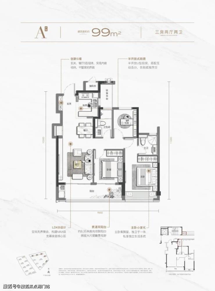 相比于168与129,99可谓将性价比拉满, 三房两卫、LDKB设计满足居住的舒适性需求, 三开间面宽+双开间阳台,将家的“观景面”放大,并且通过 创新S墙设计,实现“内嵌式”收纳,在提升收纳能力的同时,更实现墙面的平整美观。