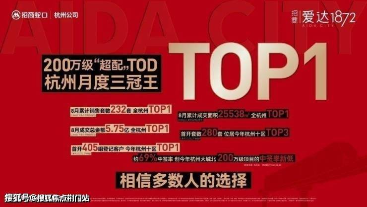 深耕杭州十载的招商蛇口,始终赋能杭州城市未来发展,择址城北核芯板块,构筑建面约51万方TOD城市综合体——招商爱达1872,在全城共鸣的热望中, 更赢得首开“三冠王”的佳绩,这是时代杭行者对产品实力的认可,更是对这座TOD综合体的无限憧憬。