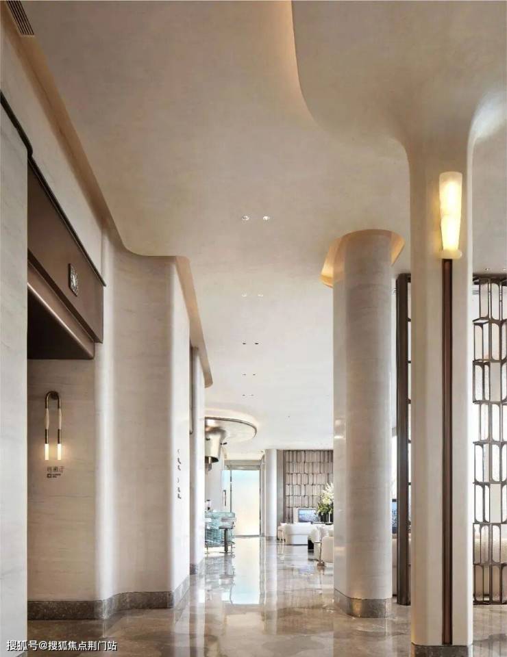主入口大门高度达到了约7米,置身其中,尊贵气派。选用贝金米黄石材、维多利亚绿与白雪公主奢石,搭配古铜色金属板,巧妙融合冷暖色调,营造出极具张力的美学效果。
