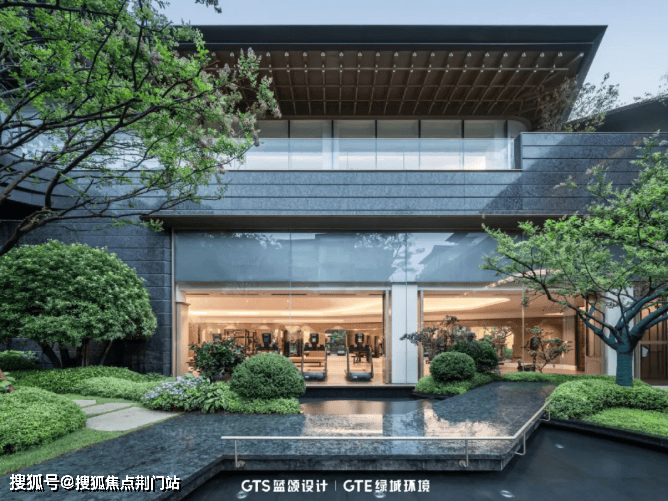 大门两侧辉映的玉石围栏、居中的铜质大门、雅致的穹顶,以及门前两株精心修剪的罗汉松,营造出一份非凡的尊贵与雅致。入口水景以九孔涌泉带来财聚福满的祝愿,中央雕塑以“舟”为灵感,用现代手法打造中式美感。四水归堂以四方水景呼应建筑的形制,浸润着归家的过渡空间。