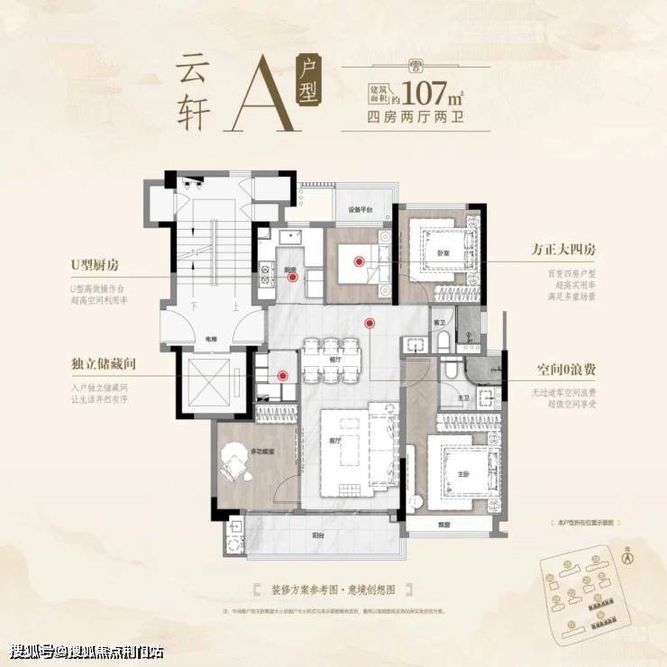 户型107㎡为10F小洋房,南北通透,采用四房两卫甚至还有一个储藏间,是眼下杭城较稀缺的小四房,大部分107㎡只能做到 3房,云涌之江实现了功能性4 房。不要小看这一个房间,基本满足二胎家庭甚至三代同堂的需求。