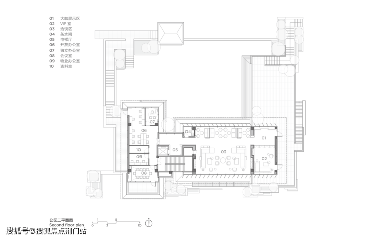 在公区入口,建筑师提取画中的山石、流水、楼阁、青松等元素意象,将之分别转译为建筑的基座、立面、屋面、景观小品等空间要素。“以筑为画”——以建筑的空间要素来重新绘就一幅“可实景体验的山水画”,并借助曲径通幽的动线设计进一步引人入画。在路径视角、环境感知的变化中,实现了画意与空间的第一步转换。