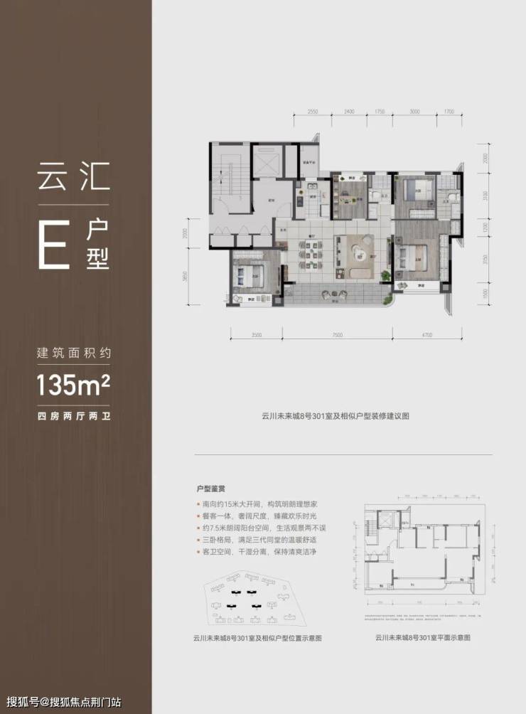 135产品,两梯两户,尊贵私密的入户。以四房两厅两卫的宽绰格局,满足三代同堂的需求。