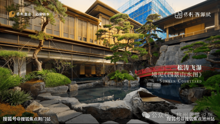 5. 取意三大宋画,融合杭州山水精粹,园林布局「一轴八境」展开,通过假山、叠水、屏风等元素,串联起移步易景的园林场景,再现刘松年的《四景山水图》。