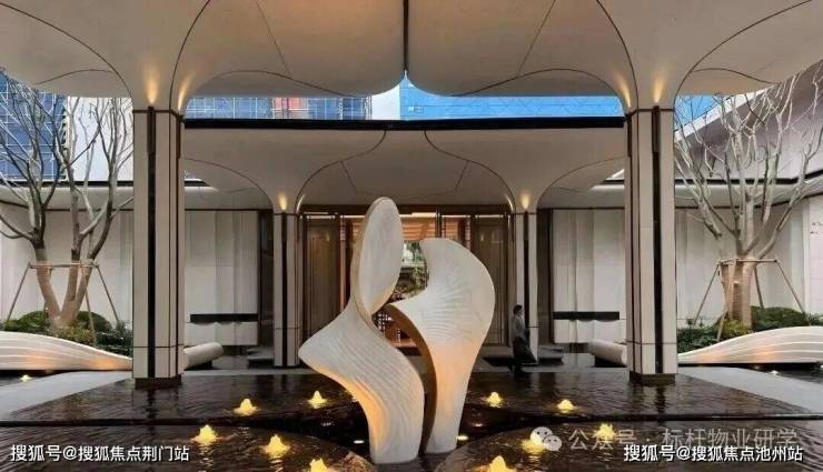 玉树门庭,传承芝澜月华的优雅入口,墙面采用贝金米黄石材,高达7米的玉树构架以UHPC材质精心打造,柱身巧妙嵌入蓝翡翠玉石与亚马逊绿奢石,尽显奢华与精致。