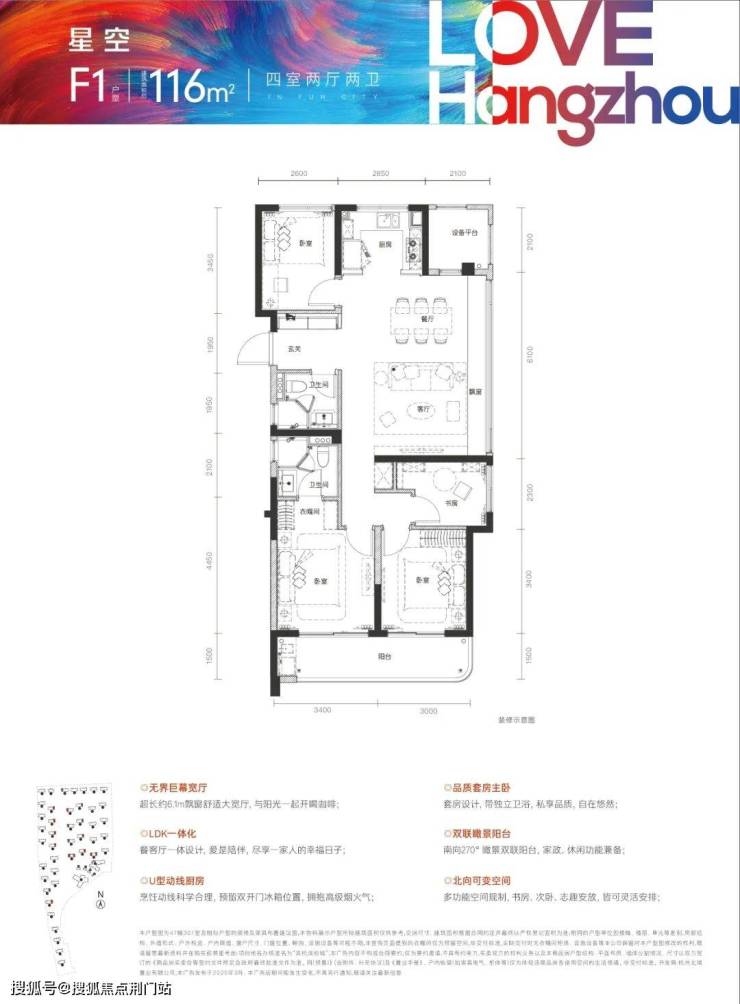 建面约116㎡边套四房两厅两卫户型,拥有约6.1米超长飘窗、舒适大宽厅、南向270°瞰景双联阳台!