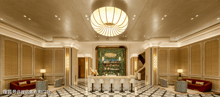 建筑外立面以“金朱丹玉”为主调,铺陈“罗琳红”奢石上墙;入口两侧,“安第斯雪景”大面展开,恍若踏进一场盛大的鎏金梦境。