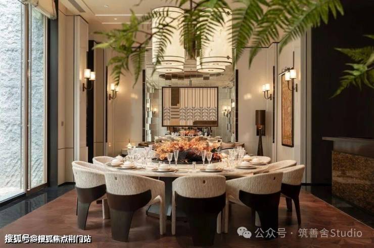 步入大门云石穹顶之下,匠心复刻古代“藻井”神韵,以522片皇家白玉精雕细琢,汇聚光华,辉映古今。华光流溢处,中心池水托举艺术雕塑,莹润皎洁,宛若稀世珍宝。立面更以铂金钻奢石铺陈,搭配墨绿荷塘月色奢石、安哥拉黑奢石花钵,以及手工锻造的巨幅铜门,于光影交错间流淌温润质感,尽显奢华风范。