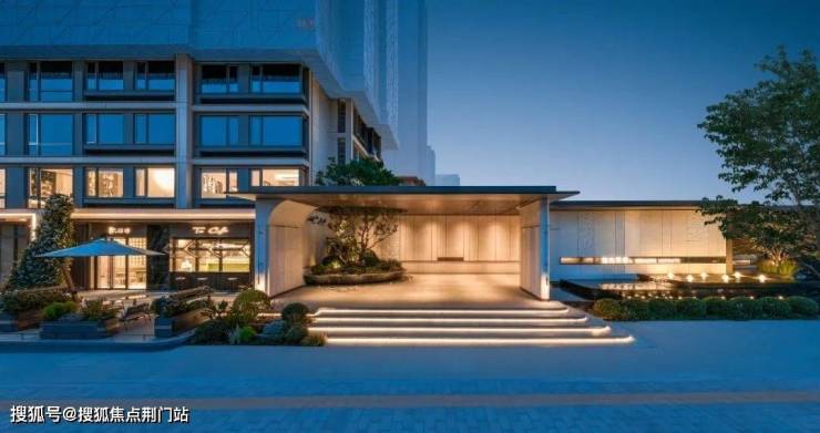 金色飘檐擦亮辨识度,南立面以大面玻璃主打,白、金、蓝灰为主调,配合部分涂料;基部用上了贝金米黄大理石,温润如月光。
