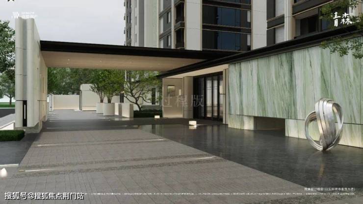 不止是壮观——他们以大尺度内退为序,贝金米黄、青绿色香格里拉石材、乔木、雕塑交错其间,非对称的自然布局, 让整个界面如一座开放的艺术馆。