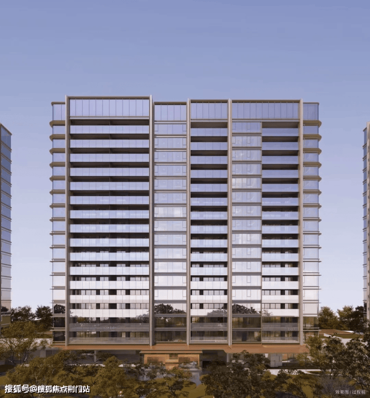 高层立面采用“三段式”设计,基座为深灰色石材,中部为浅灰色铝板与玻璃幕墙,顶部为金色铝板线条,形成“山-水-天”的层次感。