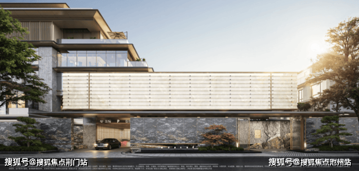 建筑取法吴越古建,三重重檐叠落映天际,宽檐浅廊承东方雅致。安哥拉黑、普拉达绿等奢石琢形,黑松红枫相映成趣,铝板、陶板与玻璃碰撞出古今对话。每一处肌理都暗藏文脉,每一寸材质都经得起时光,如吴越水墨绘就当代画境,让世家威仪与生活温度兼具。