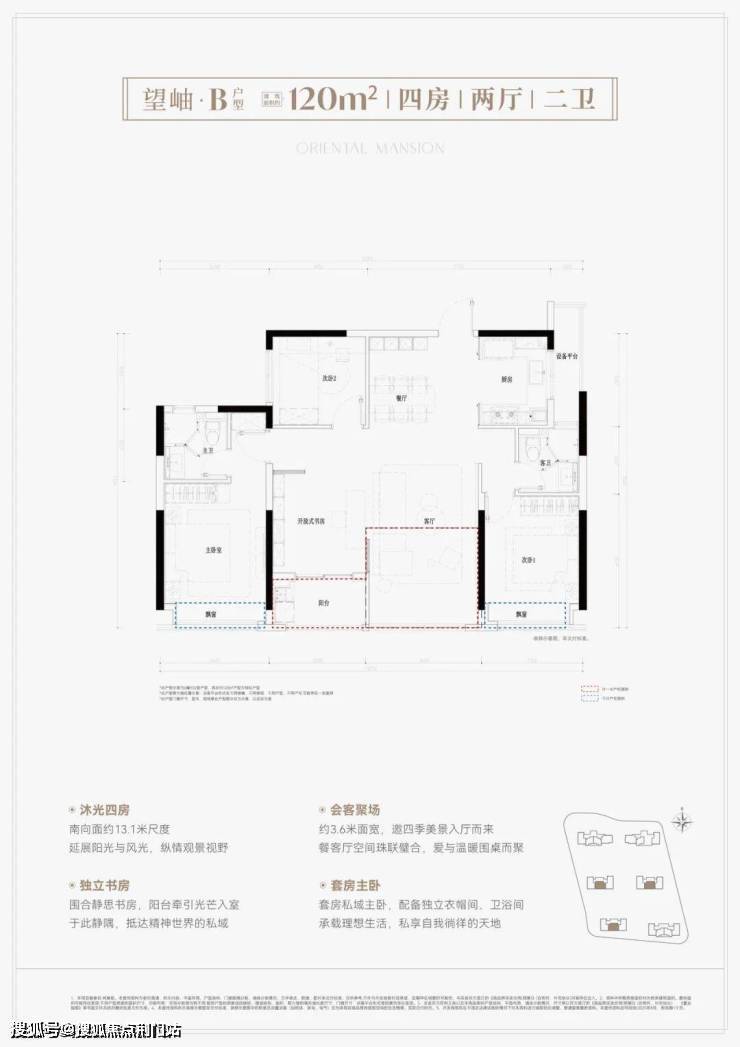 建面约120方户型:这款户型设计非常不错,在这个120方的面积段里不仅做了四房设计,而且还是四开间朝南,南向采光非常好。
