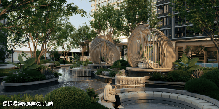 泳池综合体」它打破了传统的物理边界,让这座泳池成为园区核心景观的同时,还跟架空层、林下空间、景观卡座等等,全都结合在了一起。围上了一圈弯弯曲曲的景观水系。还做了各种高差,泳池的水漫出来,流入的是一道又一道水中树池、卡座、廊架、沙发……就像带有生命力一般,点亮一个又一个场景。