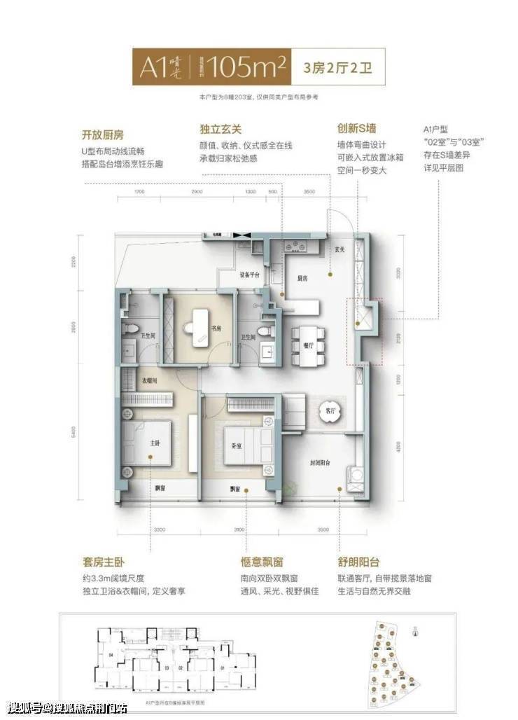 建面约105㎡晴光户型,不仅实现更优面积排布,更做到精神与审美的高度适配。在设计中,这间三房同样拥有南向大面宽,搭配S墙/开放式厨房/一体化餐客厅/多功能书房/酒店套房主卧等,将整个空间的开阔感和互动性做到极致,满足居住者对舒适、安逸的“精准需求”。