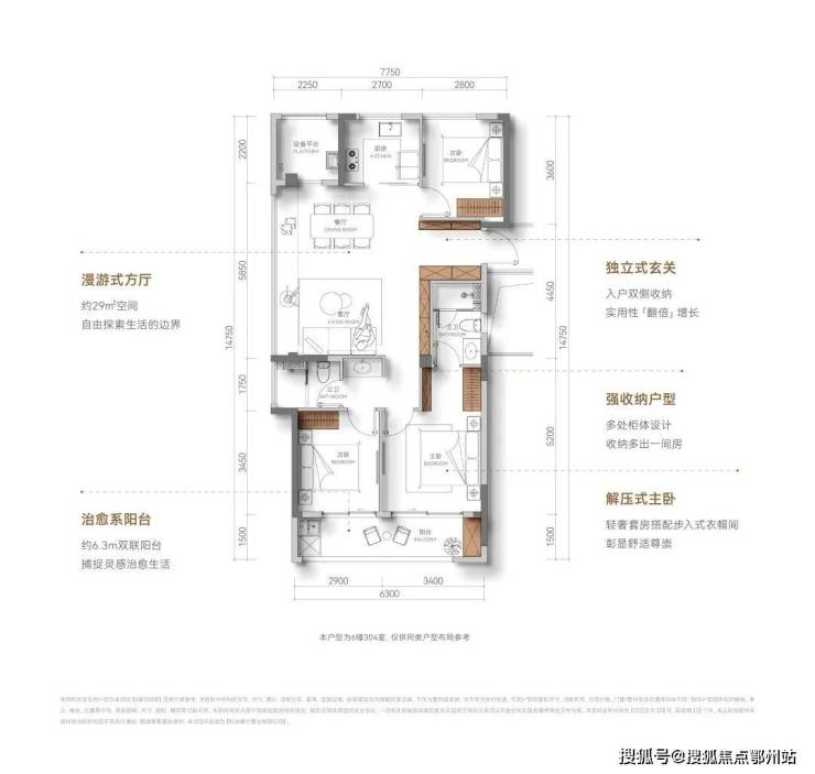 约110方的边厅户型入户玄关收纳空间拉满,可以放鞋,挂伞等,实用性倍增;大边厅带一个长长的飘窗,使得整个房子三面采光,明亮感翻倍;两房朝南,还带了跑道式阳台,约6.3米的开间,可以实现多种功能;厨房方方正正,烟道在北面的设备平台上,安放双开门冰箱,还能拥有足够的操作台面。