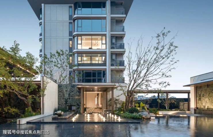 你甚至数不清,它究竟藏了多少重水的章法:大门前有“聚水生财”的雕塑喷泉,主入口有数米高的石墙瀑布。穿过风雨连廊,漂浮着约430㎡镜面水院。