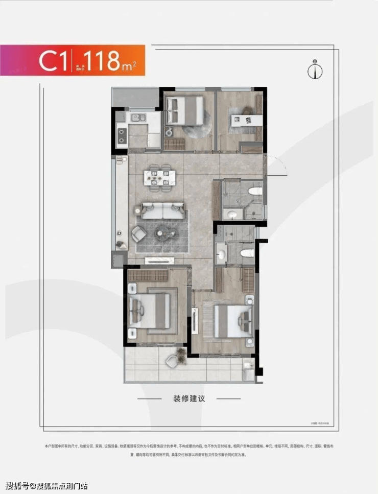 而建面约118㎡的产品即为四房两厅两卫的格局,南向双开间,双阳台相连也提供了更多的活动空间。两房朝南,区别于建面约98方户型,该户型的阳台有惊喜,是L型的。且北面多了一个房间,适合人口多的家庭。