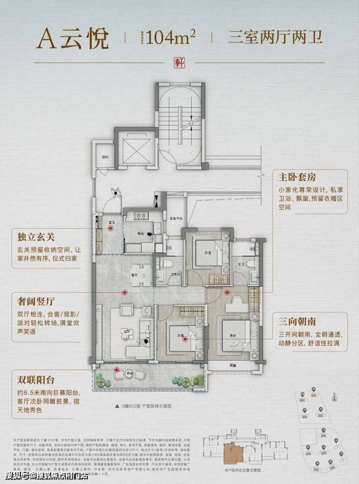 起步约104㎡,不仅做到了约6.5米双联阳台和主卧套房,还预留一整面墙的玄关收纳柜空间,主妇见了会欢呼。