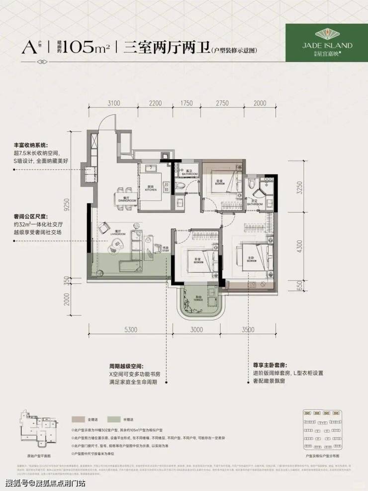 建面约105㎡南厅户型,3房2厅2卫,含赠送得房率约93%。