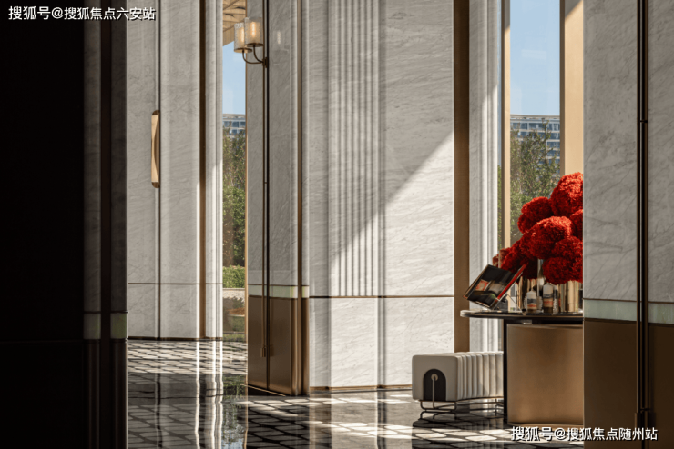 走近项目,约85米超级画幅门厅的第一笔,飞扬在高约9.5米的领域感门头之上,搭配鎏金天幕铺陈,营造出精致、轩昂、高级的华宅氛围。归家的第一眼,便是一场视觉盛宴——门头以流畅的弧线勾勒现代美学,鎏金材质在阳光下折射出奢华光泽,仿佛一座微型艺术殿堂。