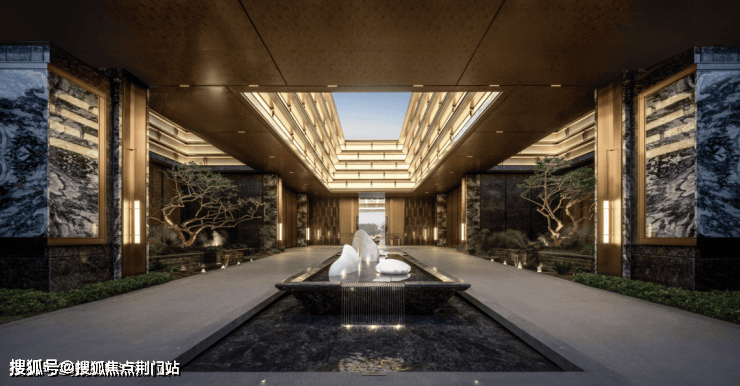 它还不止是宽,更有深度,走在这条缓坡而上的廊道上,是不一样的归家感受,两边列队欢迎的奢石,是「翠谷幽兰」,单方造价非常贵;顶上是三个玉石天井华盖,采用叠级的手法,有着宫廷的礼序。