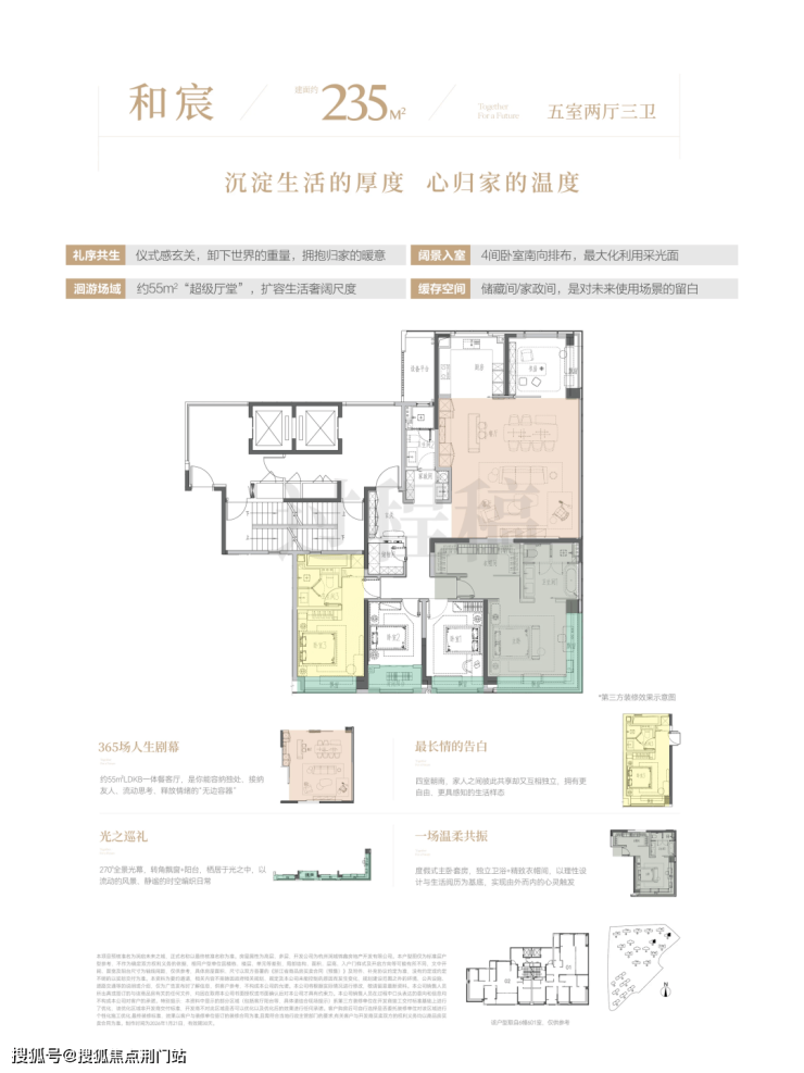 除了标配的电梯厅和玄关外,235方户型还增加了一个约3.5方的储物间,一个约4.1方的家政间,南向生活阳台也有,三卫配置也继续保持,从功能上,基本属于满配功能。