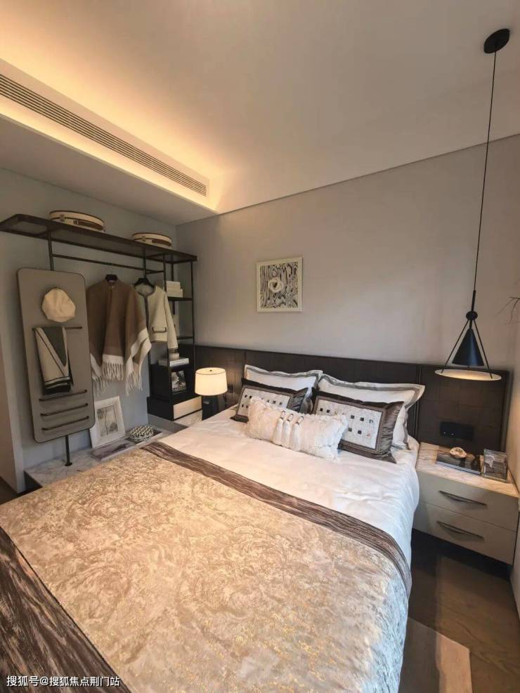 开发商在过道部分挖出了一个空间作为杂物间,本意或是想增加公共储物空间,但带来的影响就是南次卧的床头背景墙宽度只有2.55米,即便不考虑墙体厚度,若放1.5米床(实际宽度约1.7-1.8米)+0.6米深衣柜,不要说放床头柜,可能连落脚的空间都没有了,样板间的床应该是非标床。