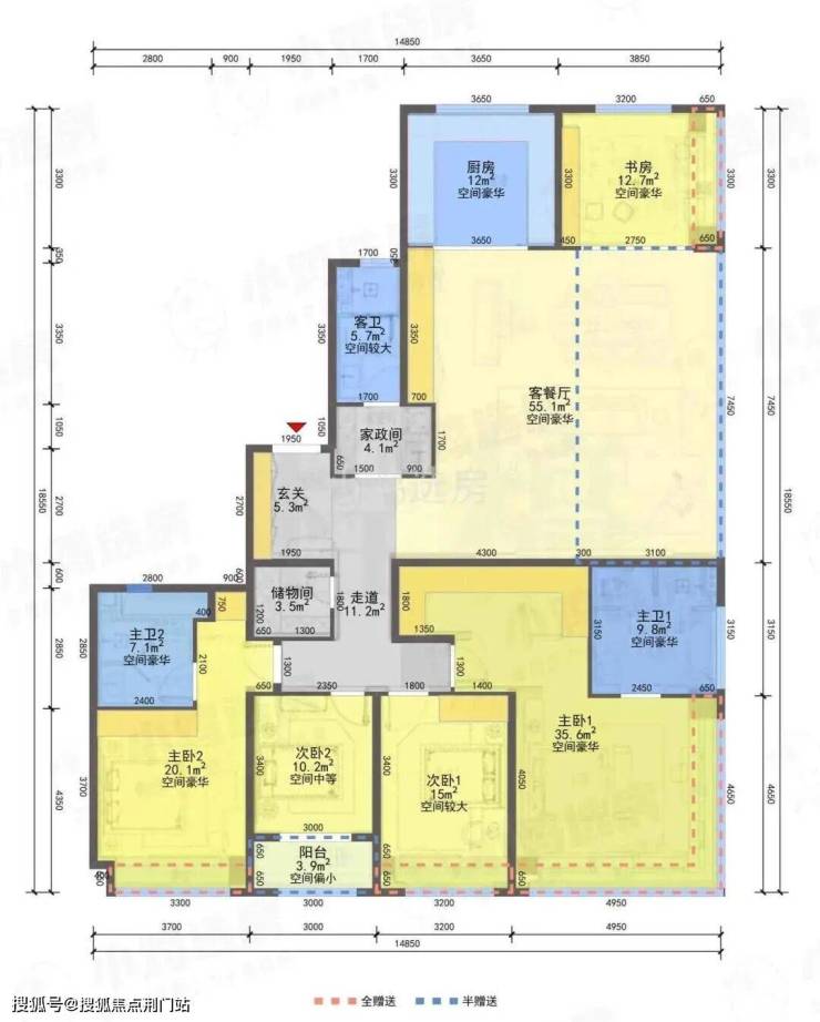 3.独立电梯厅+玄关+家政间+储物间+南向生活阳台+三卫配置,功能无死角