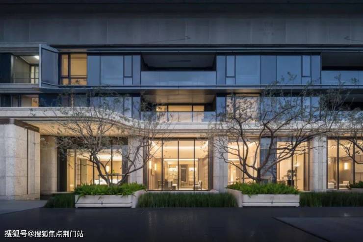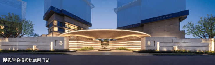 大门内外两重门厅景墙运用月光米黄石材近1000 方,搭配香槟金金属线条,汲取爱马仕全球旗舰店的双曲面叠墙造景手法,增加景墙奢华质感。 项目沿河的楼幢整体上抬,也就是——抬地式。好处在于地库通风,客户行车归家动线更合理。