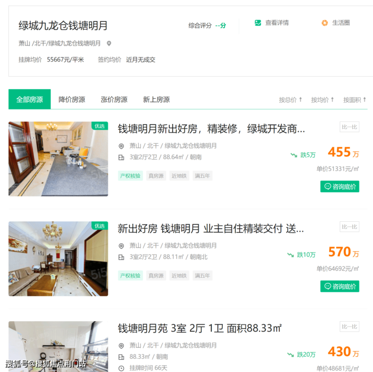 >>>隔壁的绿城九龙仓钱塘明月二手挂牌均价 约5.56万/平。