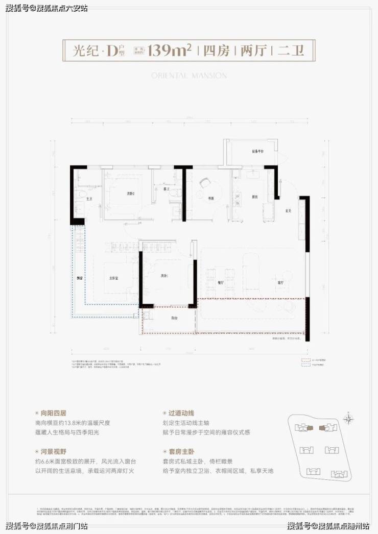 建面约120平方米户型则设计了四房且四开间朝南,南向采面极佳。而建面约139平方米大户型则打造四房两厅两卫,分为横竖两款,全部为边套,两梯两户设计。该户型得房率高达约93%,南向3个卧室,采光优良,客厅面积达到约37平方米,充分满足二胎家庭或三代同堂的居住需求。