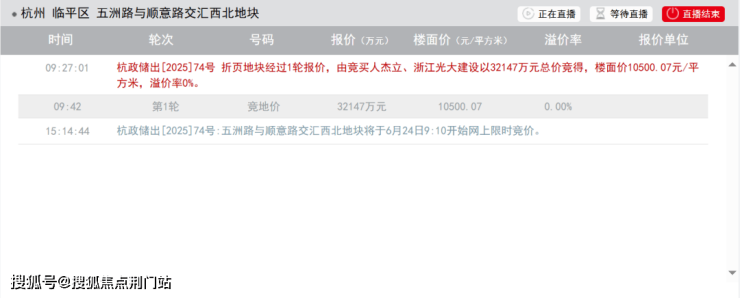 东湖新城单元LP111204-02地块过1轮报价,由竞买人杰立、浙江光大建设以32147万元总价竞得,楼面价10500.07元/平方米,溢价率0%。