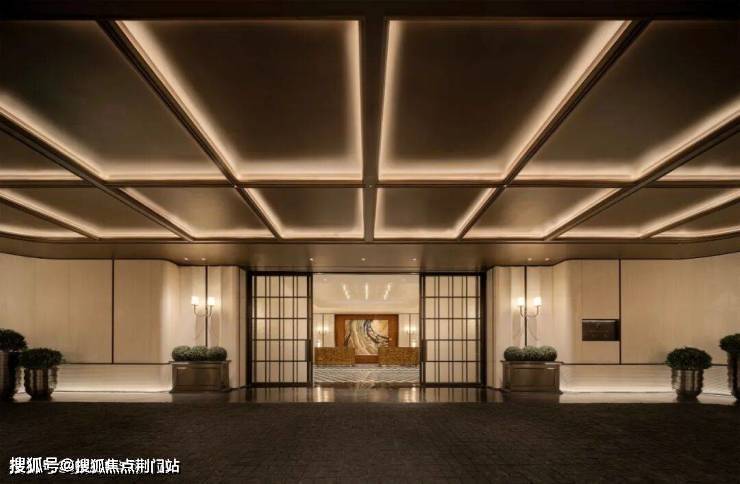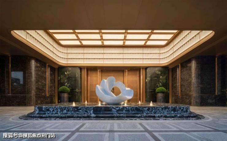 步入门庭,云石吊顶之下,借鉴中国古代建筑中的“藻井”做法,由522片皇家白玉石材拼接而成,凝聚光华,辉映时空。华光之下,中心水池承托起艺术雕塑,莹润皎洁,宛若珍宝。立面则采用铂金钻奢石,搭配墨绿荷塘月色奢石、安哥拉黑奢石花钵、以及手工锻造的巨幅铜门,流淌出一抹温润质感。