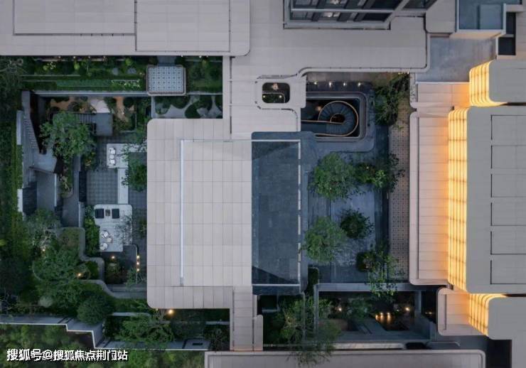 相对应的,丽香庭主入口遵循传统对称美学,采用现代工艺与材质营造奢华感;通过多重庭院,形成仪式感归家院落。同时,打破规整的水平空间布局,利用地势高差对空间进行重组、叠合,形成自由灵动的立体庭院;让人们在曲径通幽的游园路径中回归自然,抵达精神心乡。