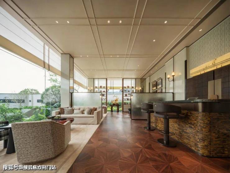 生活馆作为示范区主体建筑向内退让,嵌入两个主庭院与多个次庭院之间,大面积玻璃立面的运用,让每一个功能空间——地面层的生活馆、茶室,地下一层的健身房、瑜伽室、恒温泳池、私宴厅、棋牌室——都面向庭院景观充分打开。每一个独立的大空间内采用相对开放的功能分区,兼顾通透感与私密性。