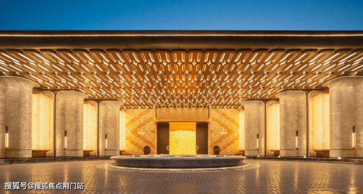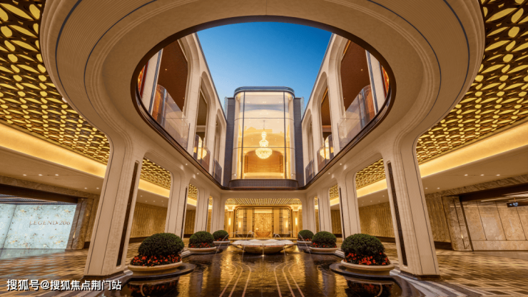 这种超阔尺度,甚至在进园区的第一刻,就被烙印在心。那座约9.5米挑高的门头,造价就高达约3000万,周身饰以巴西孔雀玉的行云流水,以及立柱屏风的壮阔。