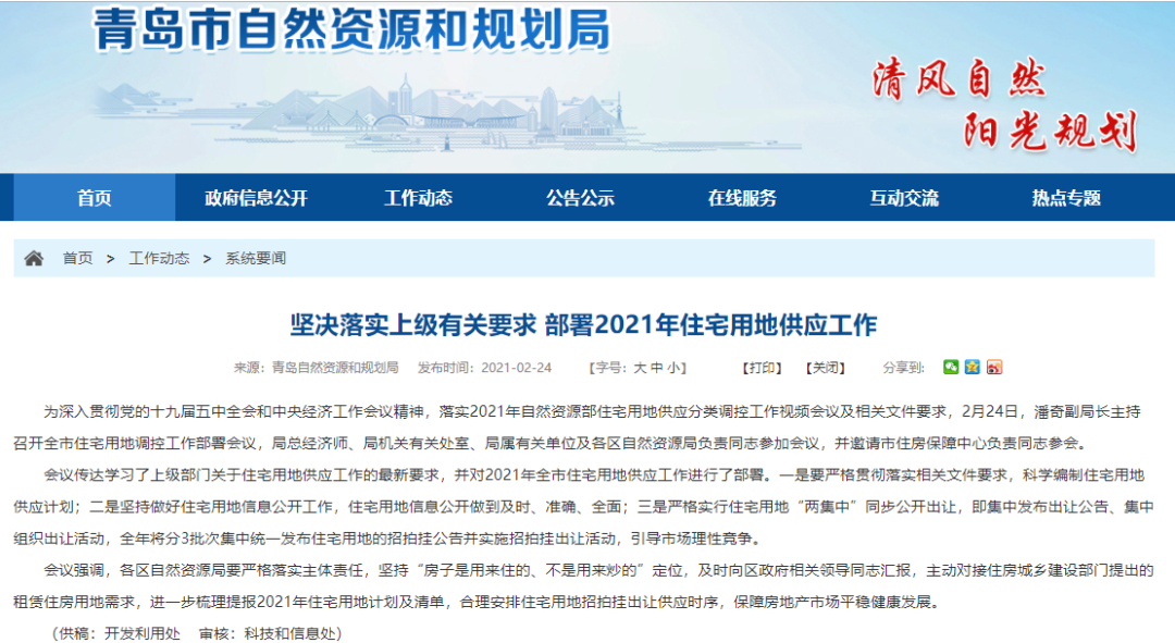 2月24日,青岛市自然资源和规划局发布通知,部署2021年住宅用地供应工作。