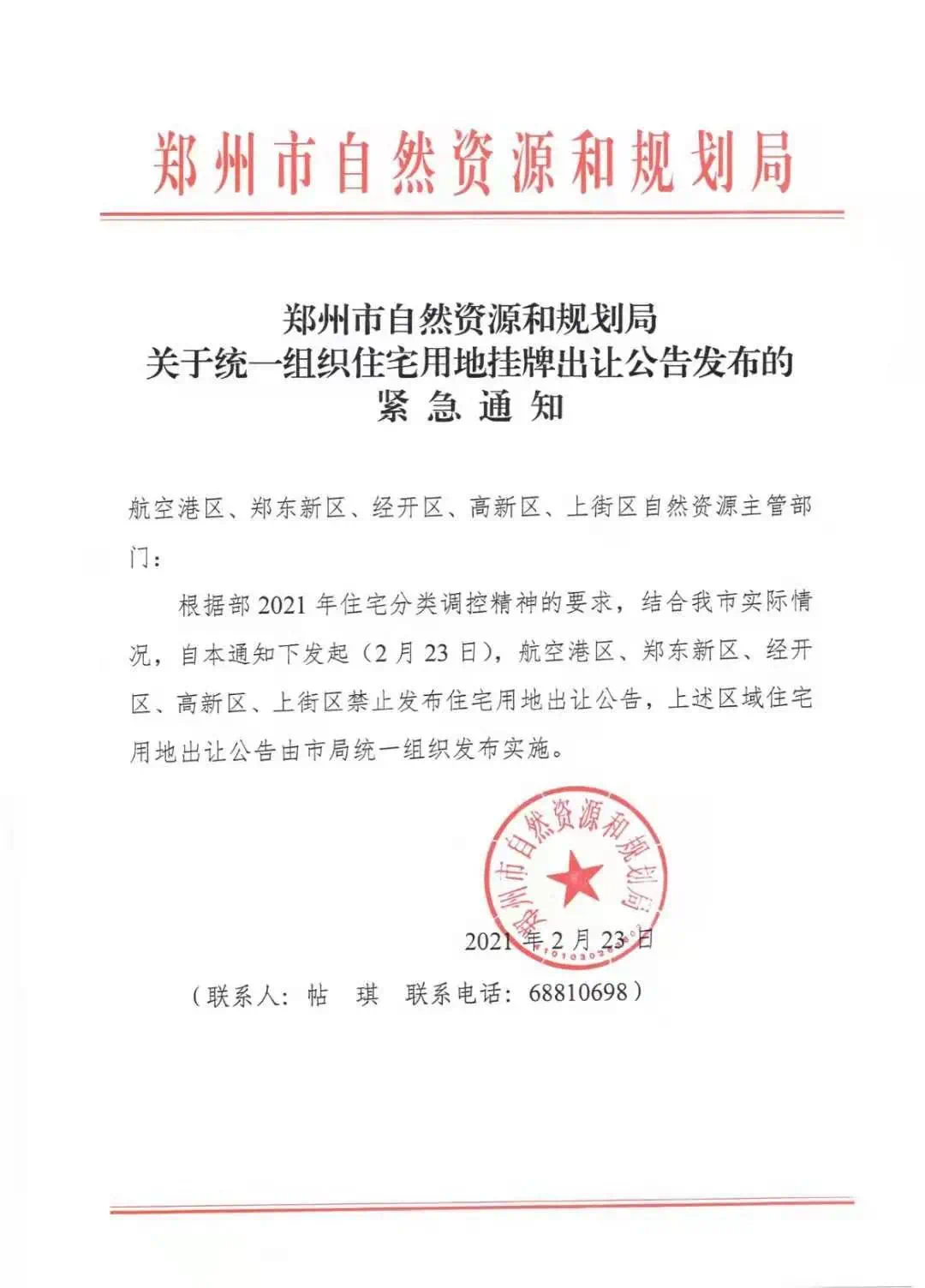 首先是2月23日,郑州发布“关于统一组织住宅用地挂牌出让公告”紧急通知,要求5大区自通知日起禁止发布住宅用地公告,转由市局统一组织发布。