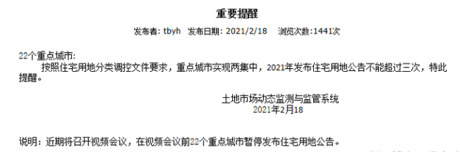 2021年,这22城住宅用地公告不能超过三次,并且集中在3月、4月、8月。