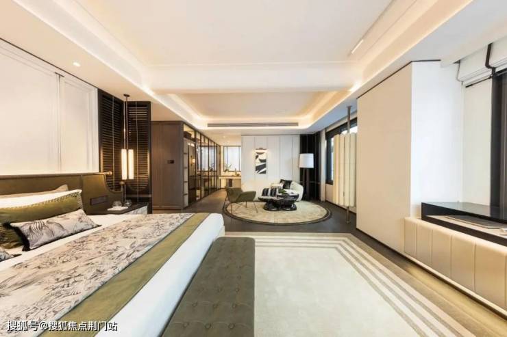 270度观景主卧,空间阔绰做到了约50方,内嵌入室玄关,超奢L型衣帽间,另设有起居室,豪华卫浴间配置双台盆+浴缸区+马桶区,高奢星级酒店套房也不过如此。