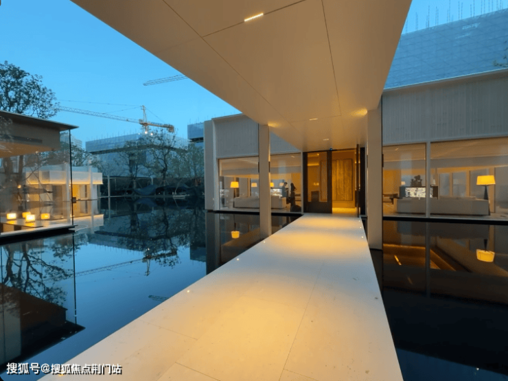 踞于水院中轴之上的“霞光亭”,纤薄顶棚以镂空金属格栅勾勒云纹,倒影入水时竟似悬亭踏浪,恍惚间亭非亭、廊非廊,仿佛界破虚实。