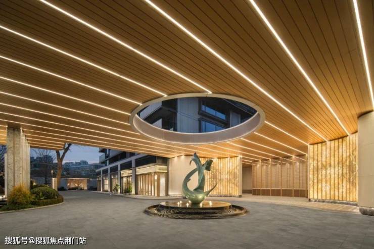 它的大门用上了贝金米黄和孔雀开屏奢石,搭配超尺的环岛落客区、对立两侧的铁冬青,一眼就贵气逼人。