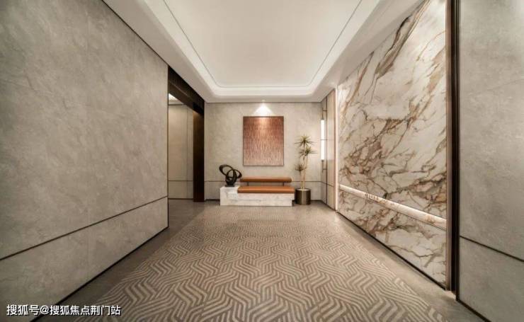 比如它的单元大堂,地面不是简单通铺,而是用上了定制波浪纹地砖,再用弧形金属波打线收边,质感特别高级。