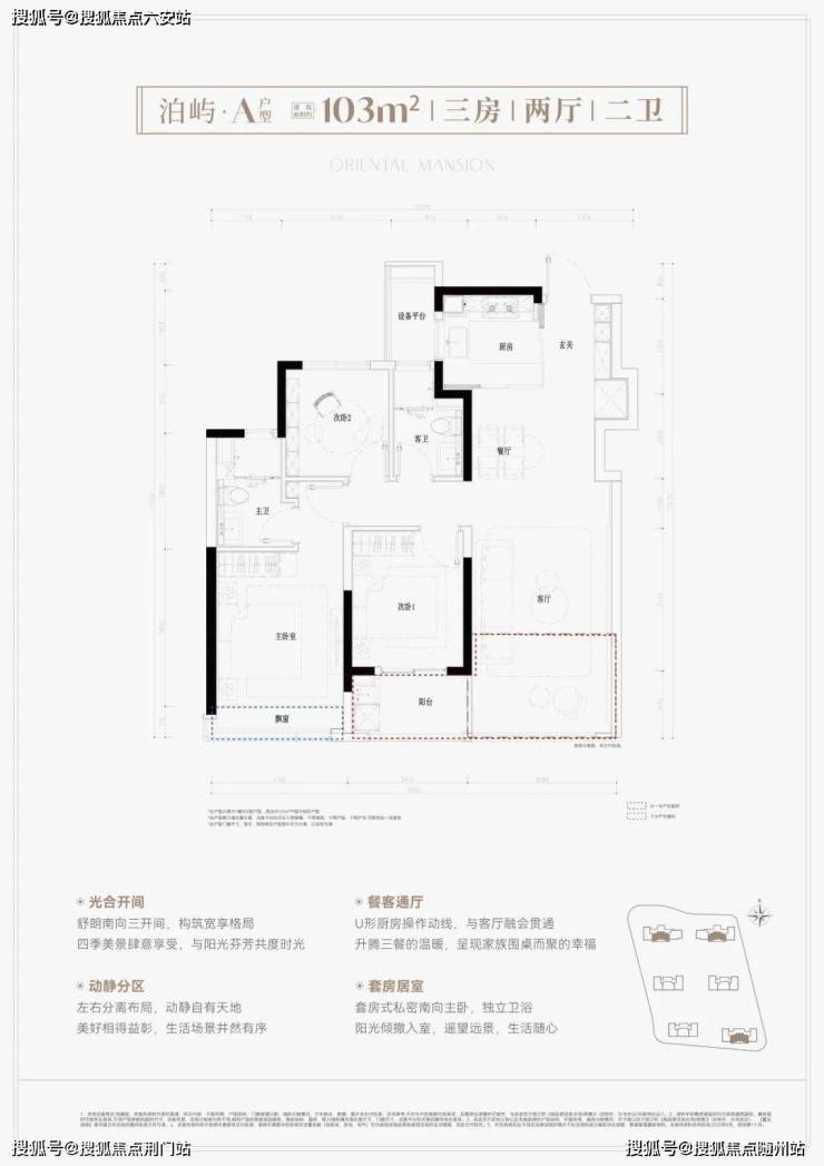 建面约103平方米户型打造三房两厅两卫,实现南向三开间,朝南次卧带阳台,客厅联通阳台后,空间感更加阔绰。U型厨房半开放设计,玄关含S墙冰箱位,大大提高了空间利用率和采光效果。