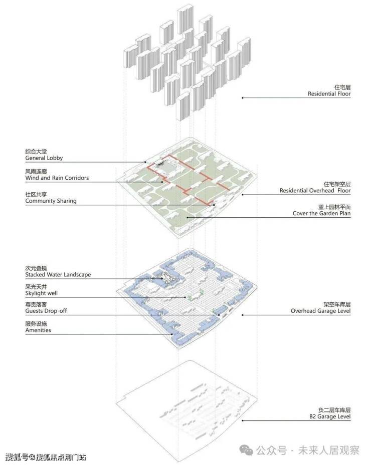 为打破城市与社区的边界隔阂,项目以 「超级底盘」 理念重新构建社区基底。通过整体抬升地下车库、融合轨道交通站点与商业配套,把地下空间升级为复合型垂直活力枢纽。